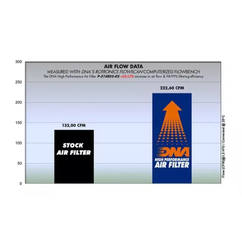 Спортен въздушен филтър DNA за многократна употреба като заместител на оригиналния въздушен филтър е създаден така че да увеличи конските сили и ускорението на мотоциклета като същевременно осигури и отлична филтрация. Филтри DNA се почистват, измиват и омасляват и се използват отново и отново. С форма и дизайн напълно пасваща към оригиналната филтърна кутия, вие имате възможност да увеличите ефективността на вашия мотоциклет изключително лесно.
